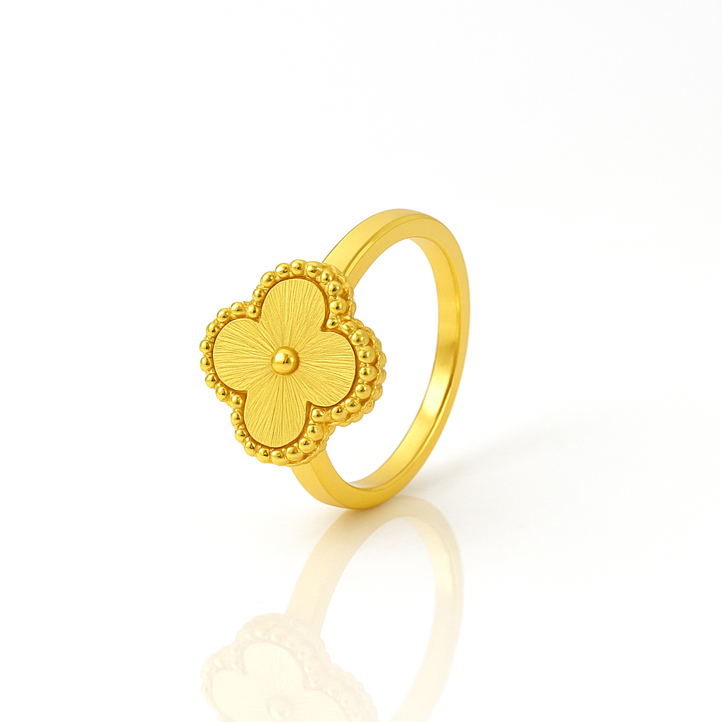 O Anel Flor de Trevo traz a delicadeza do trevo de quatro folhas, um símbolo universal de sorte, proteção e prosperidade.