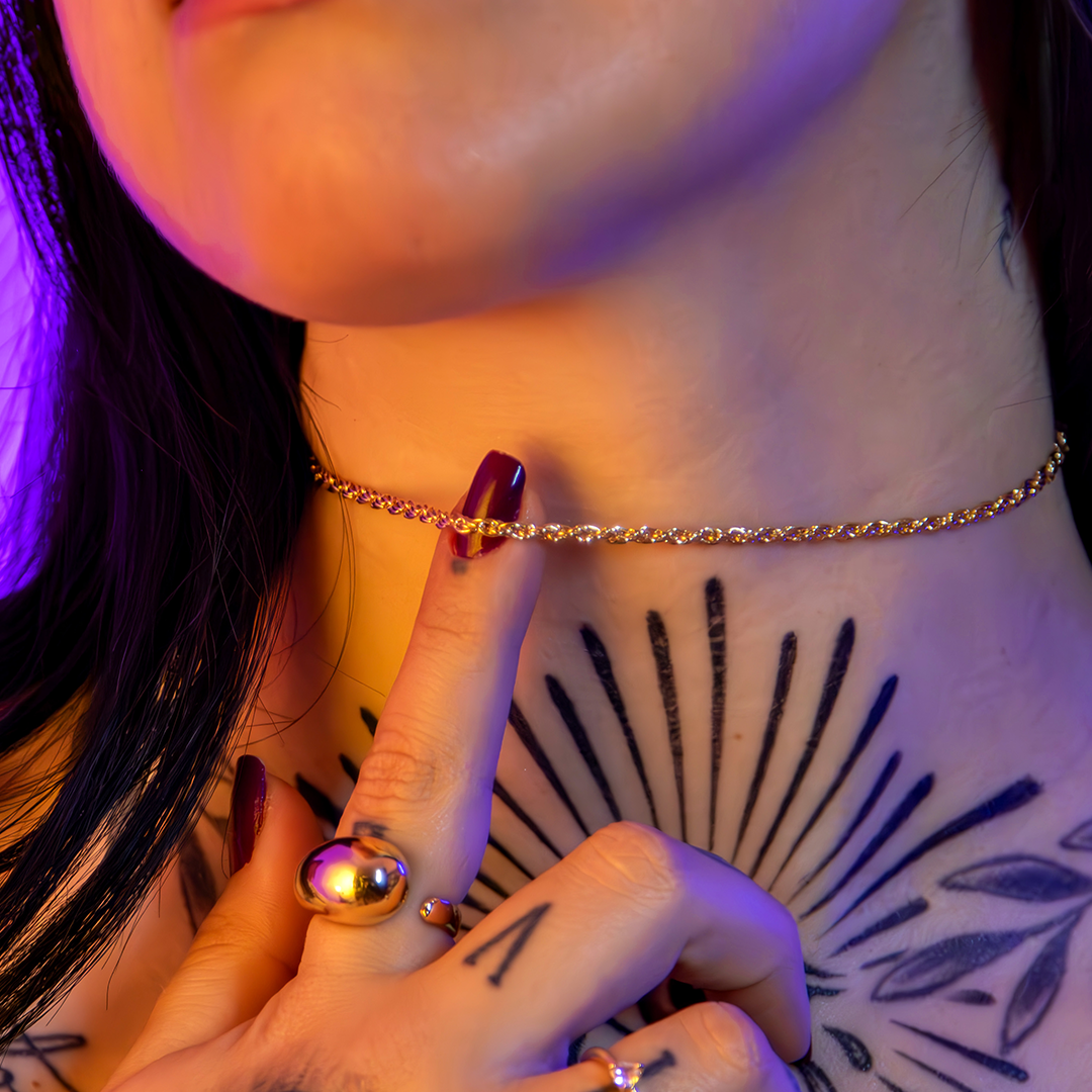 A Choker Cordao Baiano Fino é um acessório atemporal que combina sofisticação e versatilidade. Com seu design entrelaçado, transmite elegância e se adapta facilmente a diferentes estilos, podendo ser usada sozinha para um visual minimalista ou com pingentes para composições mais marcantes.