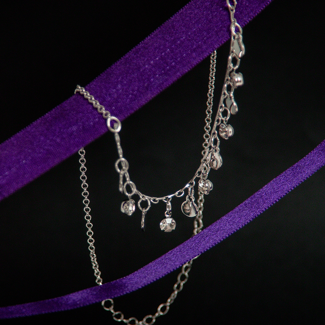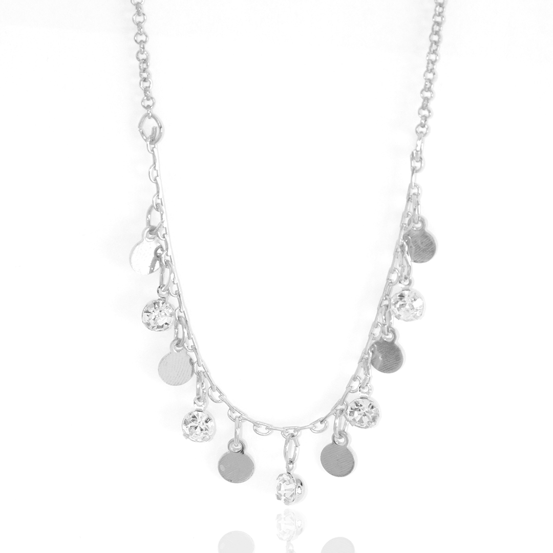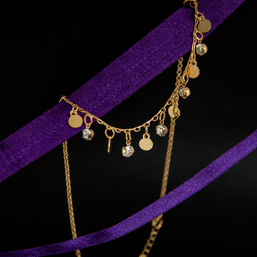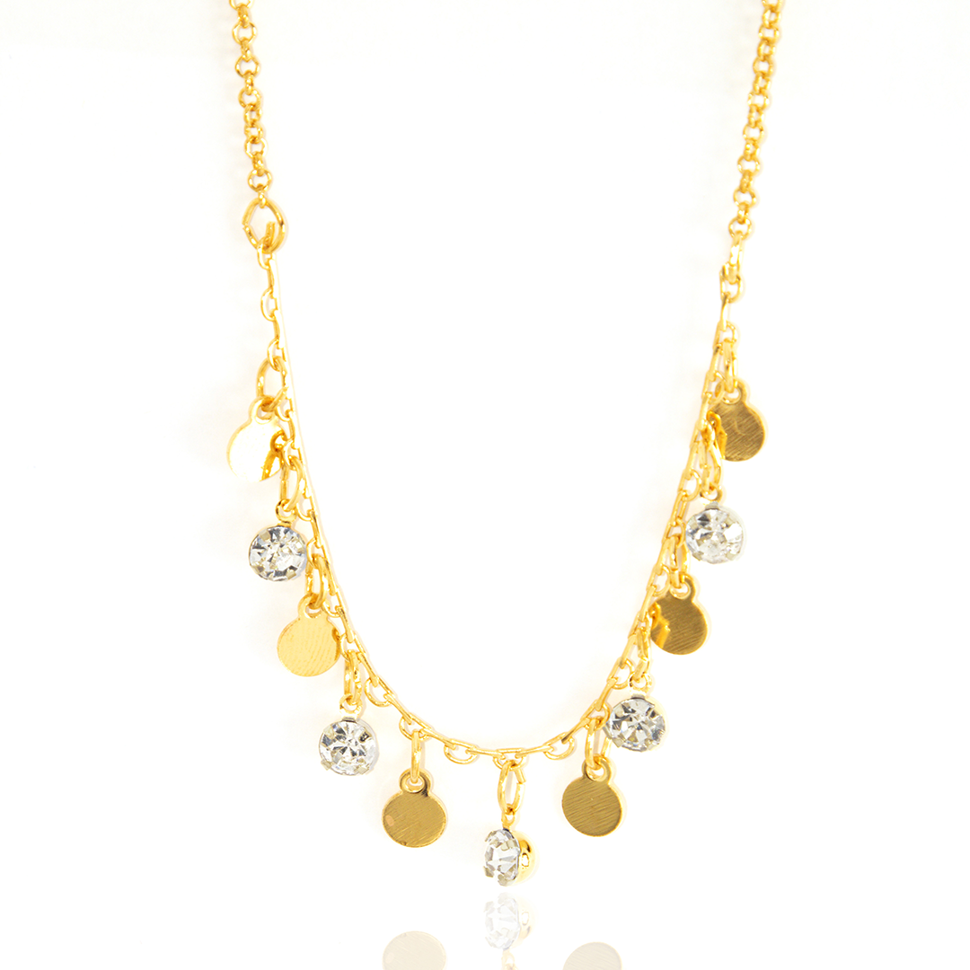O Colar Medalhinhas com Zircônias Penduradas combina o brilho delicado das pedras com o toque moderno das plaquinhas metálicas, criando um efeito dinâmico e elegante no colo.